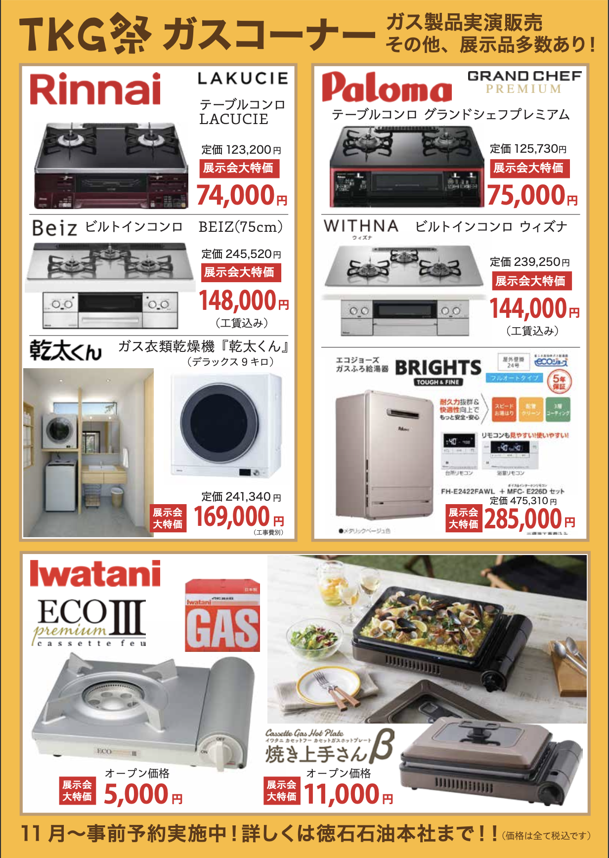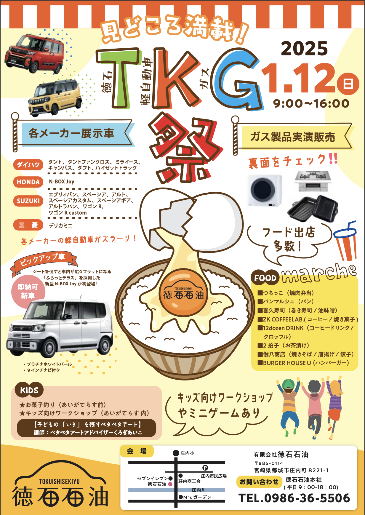 2024-10-31 配信 1/12 軽自動車とガスの展示会【TKG祭】 R7年1月12日(日)、徳石石油 本社にて軽自動車とガスの展示会「TKG祭」を開催します^^ 各メーカー、軽自動車の展示車がたくさん並びます! 他にも、キッズコーナーでは親子で参加できるペタペタアートやお菓子釣りゲーム、出店もたくさんあります! 家族でも、お一人様でも楽しんでいただける企画を多数ご用意しています☆ ぜひご家族やお友達と遊びに来てください^-^ スタッフ一同お待ちしております!! 【裏面】 一覧に戻るTOPに戻る
